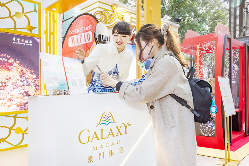 「澳門銀河」以經典的象牙色和金色作為東京路展展位的設計主調,展現綜合度假城的宏大版圖。到訪「澳門銀河」展位的賓客除了有機會與可愛孔雀造型的「童」在銀河吉祥物「小淘淘」互動以及使用即影即有 3D 相片打印機留影,更可獲得富有澳葡特式的「澳門銀河」精美記念品,感受澳門中西文化交融的歷史氛圍。