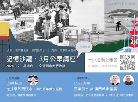 本次活動將於3月23日(六)下午在青洲水廠行政樓(澳門青洲大馬路718號)舉行,首場講座講者為遺產學會副會長勞加裕,主講“從井水泉水到西江水——回顧澳門百年供水的演變”;次場為專家對談,邀請了文化遺產建築師呂澤強和城市規劃師林翊捷,共同分享“百年供水與澳門城市發展”,每場講座和對談附設水廠參觀活動,讓大眾能更直觀和生動了解有關澳門的水資源處理和供應。