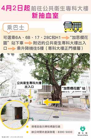 【特訊】衛生局仁伯爵綜合醫院為了讓居民在更寬敞及舒適的環境中進行抽血服務,以提升接受醫療服務的體驗,自4月2日起抽血服務從原址醫院大堂的抽血室,遷移至公共衛生專科大樓內的新抽血室進行。原址於搬遷日(即4月2日)起停止運作,醫院將以短訊通知已預約人士,相關人士請前往新抽血室報到及接受服務。具體前往路線如下:1、乘巴士:可選乘6A、6B、17、28C和H1,在“加思欄花園”站下車後,經該站點附近的公共衛生專科大樓出入口進入,再乘升降機往5樓(專科大樓正門樓層)的新抽血室。2、乘車:可乘車至公共衛生專科大樓正門下車,由正門進入新抽血室。3、自駕:自駕人士可停泊加思欄後新馬路與若憲馬路之間的“公共衛生專科大樓公共停車場”,再乘升降機往5樓(專科大樓正門樓層)的新抽血室。4、經醫院大堂:連接仁伯爵綜合醫院與公共衛生專科大樓的行人天橋已開通,居民可經仁伯爵綜合醫院大堂往婦兒科大樓方向的行人天橋,前往公共衛生專科大樓7樓,再乘升降機往5樓(專科大樓正門樓層)的新抽血室。