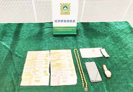 【特訊】一名內地男子涉嫌於日前在氹仔一間押店典當一條假金鏈,詐騙押店五萬四千港元,疑犯經港珠澳大橋口岸出境時被司警拘捕,司警檢獲三萬港元懷疑犯案所得現金,疑犯拒絕與司警合作,司警仍就案件作出跟進。