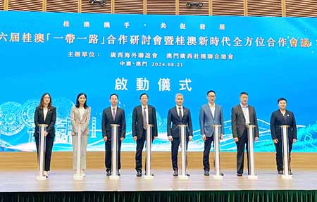 廣西海外聯誼會、澳門廣西社團聯合總會合辦的「第六屆桂澳『一帶一路』合作研討會暨桂澳新時代全方位合作會議」昨午假科學館舉行,經濟財政司司長代表、經濟及科技發展局局長戴建業等出席。研討會邀請多位桂澳金融界權威講者,圍繞金融政策創新、市場發展現狀及投資融資環境等議題深度討論。
