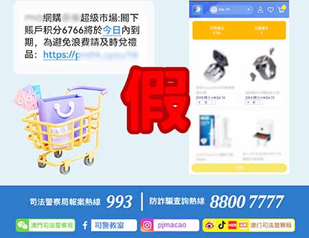 【特訊】司警局於昨日(10月20日)發現有騙徒假冒港澳大型連鎖超市向市民隨機發送釣魚短訊,訛稱市民帳戶積分即將到期,要求市民點擊短訊內附帶之連結進入一個假冒該超市的網站,誘騙市民輸入個人資料及信用卡資料以低價加積分換取禮品,藉此盜取市民的信用卡資料以進行非授權之大額交易。