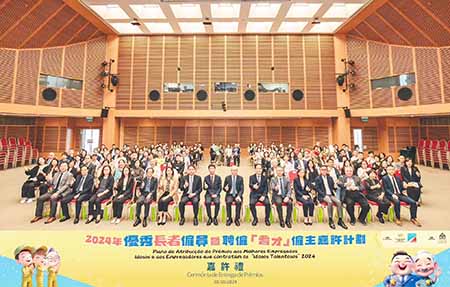 【特訊】由社會工作局與勞工事務局合辦、社會保障基金協辦的“2024年優秀長者僱員暨聘僱「耆才」僱主嘉許計劃”嘉許禮,於10月30日下午假澳門科學館會議廳舉行,獲嘉許的優秀長者僱員共有10名、「耆才」僱主的商戶和機構共有62間。有關嘉許計劃目的為表揚優秀長者僱員在不同工作崗位上的卓越表現,以及對聘用長者僱員的商戶、機構或單位作出公開嘉許,藉以促進社會各界對長者的工作經驗及就業能力的欣賞和認同,為長者提供更多合適的就業機會。