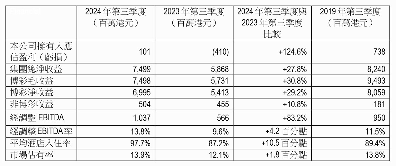 澳門上葡京綜合度假村(「「上葡京」); 季度內,上葡京的毛收益達到17.77億港元,主要得益於博彩毛收益增加至14.23億港元,穩健 的非博彩收益則貢獻了3.54億港元,表現出色。去年同期,其博彩毛收益為7.83億港元,非 博彩收益則是3.01億港元。上葡京的經調整物業EBITDA增長至1.65億港元,與上季度的1.04 億港元,以及去年同期的2,700萬港元虧損相比,展現出強勁的復甦。財務表現反彈,充分反 映了業務已明顯步入上揚軌道,並藉此改善收入來源,以及優化上葡京的各式各樣的營運表 現。 上葡京在 2024 年第三季度的入住率躍升至 98.9% ( 2023 年第三季度:85.4%)。