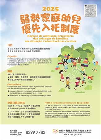 【特訊】社會工作局協調受資助托兒所推行的「弱勢家庭幼兒優先入托制度」將於2025年1月6日起接受申請。有關制度為缺乏照顧條件及經濟存在困難的弱勢家庭幼兒,優先提供受資助托兒所全日班服務。