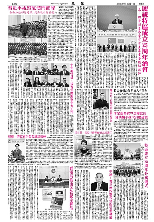 劉金玲表示,習主席在講話中以三個“好制度”闡述“一國兩制”對澳門長期繁榮穩定發展的必要性和優越性,一方面是認可具有澳門特色“一國兩制”25年來實踐取得的巨大成功,另一方面是向世界展示“一國兩制”不但是“行得通,辦得到,得人心”具有示範作用,其“和平、包容、開放、共享”的價值理念,是港澳發展最佳制度安排,必須長期堅持。另一方面,習主席在對澳門發展提出的四點希望中,特別提到“促進政府治理同社會調節、市民參與良性互動,引導和規範社團發展,築牢基層治理根基”,劉金玲認為這是習主席對廣大澳門愛國愛澳社團今後在社會上發揮好橋樑作用提出進一步的要求,不但需要新一屆特區政府和社會各界共同努力,更需要社會各界珍惜且鞏固好澳門回歸25年來之不易的繁榮穩定局面,從而實現居民對美好生活的嚮往。