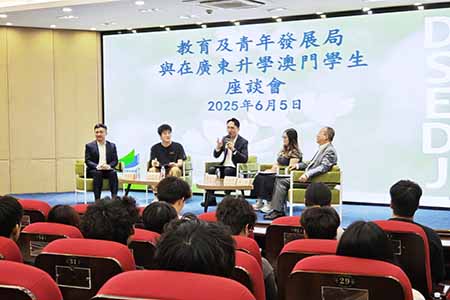 【特訊】為支持和關懷在外地升學的澳門學生學習生活,藉在廣州市出席澳門青年大灣區職業之路雙選會,教育及青年發展局局長龔志明、副局長黃嘉祺及社會文化司司長辦公室顧問秦斌於六月五日假暨南大學與在廣東省升學的澳門學生進行座談交流,約八十人參與。