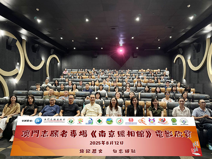 【特訊】為銘記南京大屠殺歷史,弘揚愛國情懷,澳門志願者總會聯同屬下分會,於8月12日晚假金銀島「博納國際影城」舉行澳門志願者專場-《南京照相館》電影欣賞會,吸引逾100名志願者參與。活動冀透過電影藝術,喚起社會對歷史的關注,傳承愛國情懷,共同維護和平繁榮。