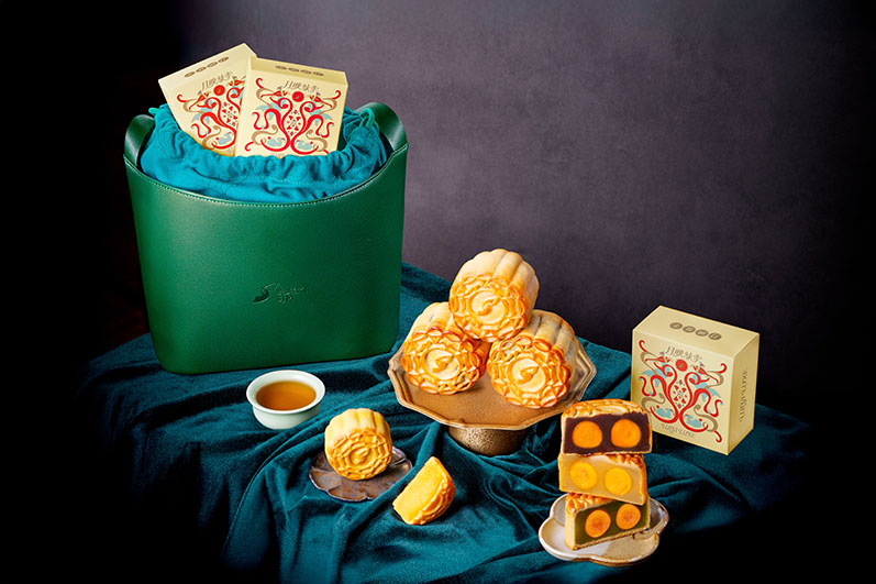 《「月映絲牽」系列.佳品慶團圓》「月映絲牽」系列由本地年輕設計師歐俊軒操刀設計,靈感源自「花好月圓、人月雙全」,禮盒外型突破傳統,採用高貴典雅的皮革,打造別緻水桶袋,綴以圓月與桂花圖騰,並內襯帆布束口袋,時尚美感與實用功能兼備。三款精選禮袋及兩款禮籃,無論是饋贈摯愛,抑或為自己增添一份節日儀式感,皆為別具品味的首選:「月映絲牽」迷你奶皇手工月餅禮袋(澳門元 468)六枚迷你奶皇月餅鬆軟細膩,金黃餅皮包裹絲滑內餡,香甜不膩。「月映絲牽」經典手工月餅禮袋(澳門元 508)兩款經典口味——雙黃白蓮蓉與雙黃斑蘭蓮蓉月餅各兩枚,外皮金黃酥潤,蓮蓉細滑甘香,斑蘭清新宜人,鹹蛋黃金燦香醇。「月映絲牽」雙色手工月餅禮袋(澳門元 508)包含雙黃斑蘭蓮蓉與雙黃陳皮豆沙月餅各兩枚,後者選用珍貴陳皮,搭配慢火細熬的紅豆,口感甘香綿密。