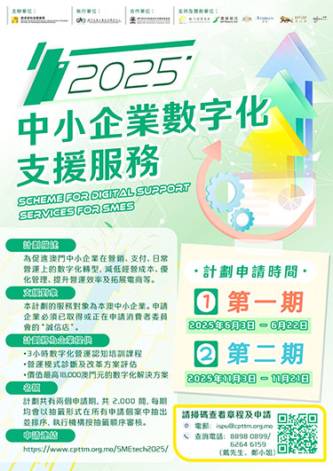 【特訊】為提升企業競爭力及營運效率,助力本澳中小企業加快數字化轉型,經濟及科技發展局推出“2025中小企業數字化支援服務”(下稱“計劃”),並委託澳門生產力暨科技轉移中心執行。該計劃第二期將於今(3)日起至2025年11月21日接受申請,提供750個支援名額。歡迎有興趣的企業踴躍報名。