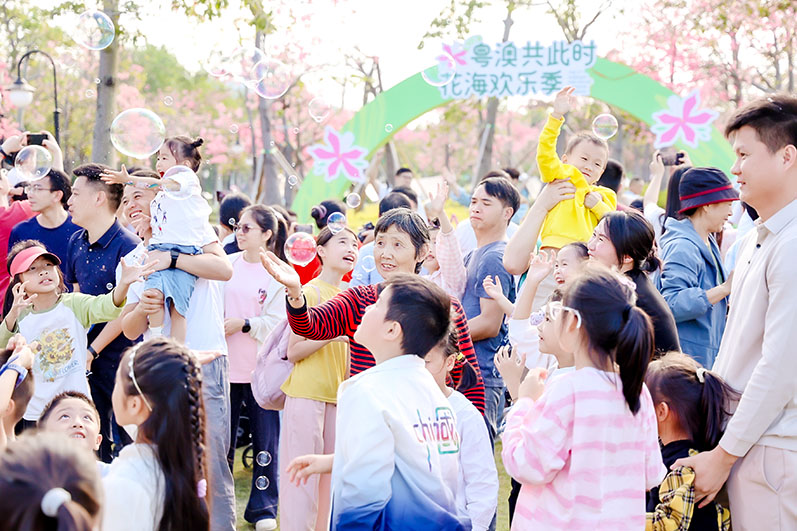 演員與觀眾零距離互動,孩子們在泡泡的世界裡奔跑歡笑,市民遊客紛紛拍照留念,花海長廊變成了一幅充滿笑聲與藝術氛圍的流動畫卷。