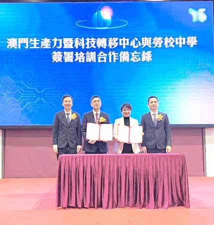 生產力中心理事長關治平與勞校中學校長鄭杰釗,在教育及青年發展局處長梁怡安及華為澳門公司副總經理朱志華的見證下,共同簽署培訓合作備忘錄。勞校中學於本學年的高中年級增設了華為人工智能(HCIA-AI)課程,課程內容涵蓋機器學習、深度學習及大模型基礎等核心知識,並結合華為的人工智能平台進行實操,協助學生掌握AI理論及應用能力,為其升學及職業發展奠定基礎。