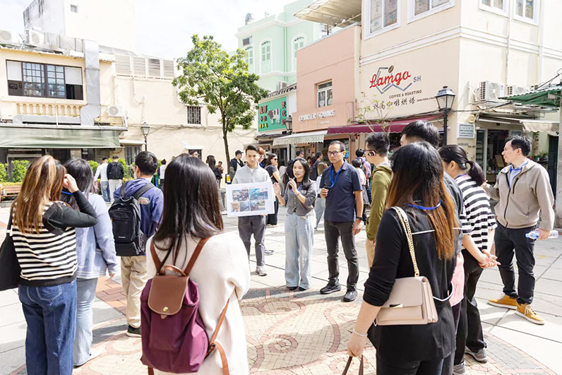本次考察由澳門立法會議員梁孫旭與城市規劃師陳昭怡聯合領隊,路線覆蓋益隆炮竹廠、氹仔街市、官也街、兵營斜巷及新城C區等多元場域,引導參與者從“點線面”不同維度,立體感知澳門文旅生態的構成與演變。在氹仔舊城區的街巷間,陳昭怡引導青年對比街區商鋪業態的差異化特徵,共同探討特色單品突圍與多元業態共生的市場邏輯。其間咖啡店緊抓澳門演唱會經濟紅利的經營智慧頗受關注,商店通過推出明星聯乘產品、營造主題化店面、建立特色打卡牆等方式吸引客流,青年們直觀體驗到流量經濟與實體商業融合的價值潛力。