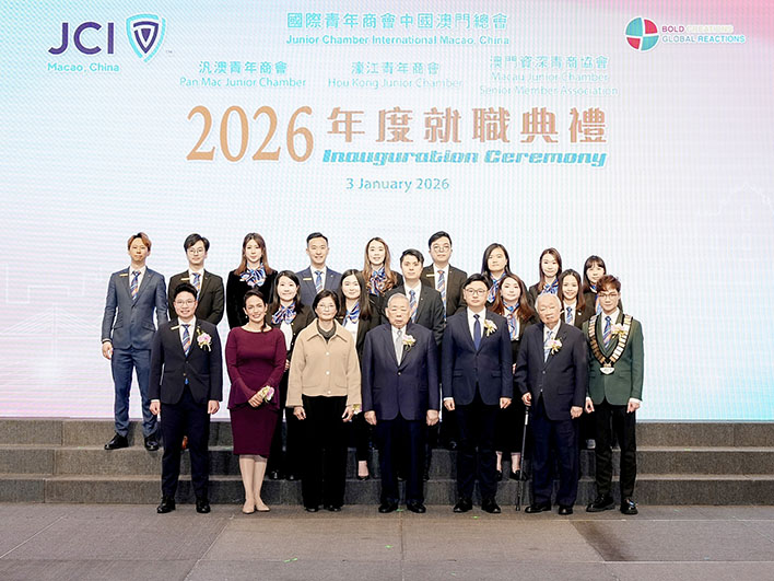 【特訊】國際青年商會中國澳門總會暨屬下分會:汎澳青年商會、濠江青年商會及澳門資深青商協會之2026年度理事局成員就職典禮已於1月3日舉行。總會會長陳嘉俊致辭時表示,未來將堅定踐行國際青年商會的使命與願景,致力構建青年發展平台,專注培養領導才能與社會責任感,持續推動青年成長並帶來正向改變。他強調,將積極依託青年商會的全球網絡資源,並緊密結合國家發展戰略,全力支持澳門青年拓展國際視野、把握國家機遇,為青年融入和服務國家發展大局創造更廣闊的空間。