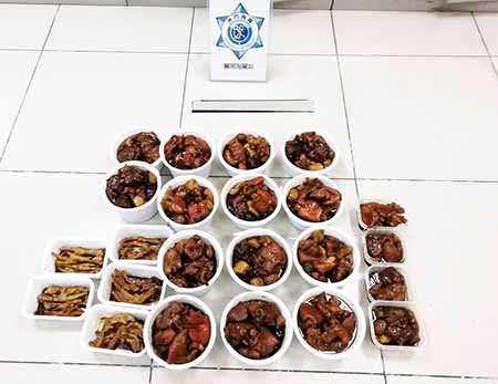 2025年12月30日及31日,海關人員透過風險管理系統的預警佈控,在關閘口岸和港珠澳大橋澳門口岸的入境車道分別截查兩輛跨境車輛,駕駛者均為男性澳門居民,經檢查,發現該兩人試圖將合共400盒盒裝即食花膠鮑魚及27.5公斤未經檢疫熟食偷運入境。