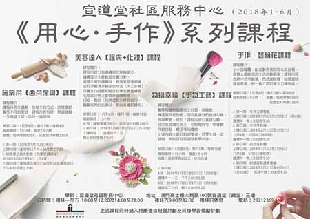 【特訊】宣道堂社區服務中心課程消息:本中心的《用心.手作》系列課程現已招生,該系列包括以下課程,施房菜(西式烹調)課程,上課時間是週日下午四時半至七時,美容達人(護膚化妝)課程,上課時間是下午八時至九時半,勾織幸福(手勾工藝)課程,上課時間是下午二時至三時半,以及手作.麵粉花課程,上課時間是下午八時至九時半,上課地點是高士德宣道堂。上述課程同時納入持續進修發展計劃及終身學習獎勵計劃,歡迎興趣人士參與!詳情可致電28212369(林小姐、黃先生)或瀏覽http://mecccmacau.org/