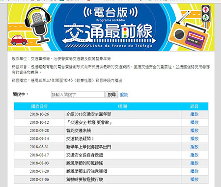 大賽車是澳門體壇的年度盛事,在街道串連而成的東望洋跑道上競賽極具挑戰性,每年均吸引大批車手和旅客來澳參與,配合賽事需要,本澳多處道路會臨時封閉或作出調整,多條巴士路線改道行駛,如何可以輕鬆出行及了解更多賽車期間的交通資訊,請留意由交通事務局、治安警察局及教育暨青年局聯合製作的“交通最前線”,節目於澳門電台“教青社區”節目時段(上午10時30分至10時45分)內隔周五播出,節目重溫可登入交通事務局網頁www.dsat.gov.mo或教育暨青年局網頁。