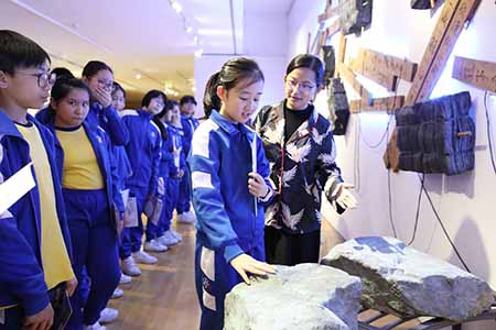「走進藝博.涵泳藝文」活動的目的是鼓勵學生走進戲院和藝術博物館,近距離觀賞視覺藝術作品,並配以生動的導賞方式,讓學生認識欣賞展覽時應遵守的禮儀,培養對視覺藝術作品的賞析能力,從而提升學生的審美能力。除了透過輕鬆活潑的影片向學生介紹參觀博物館的規則及禮儀外,導賞員還會扮演鮮明有趣的角色,引導學生參觀「海上生輝——故宮博物院藏海派繪畫精品展」,透過生動的導賞,學生不但認識到中國書畫的藝術特色及其裝裱特點,同時,學生透過陳設「枯山水」(人造石景、石米流水)、小花草等擺設,體驗畫中人文與自然互動互融的趣味;透過欣賞「爍•園——管懷賓作品展」作品,引領學生搜尋作品的中華文化元素,體驗藝術家以傳統文化融入當代藝術元素中所呈現的「園」的氛圍,並感受中國古典造園美學與新媒體空間裝置碰撞所帶來的詩意。