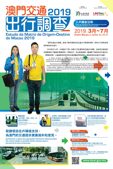【特訊】2009及2014年,本澳進行了第一及第二次全澳居民交通出行調查,為制定交通政策和規劃提供了關鍵的基礎資料。時隔五年,交通事務局將於今年3月至7月開展「澳門交通出行調查2019」入戶調查,冀透過定期的調查收集本澳居民的交通出行習慣和特徵,以通過更有針對性的交通規劃和管理措施,提高居民的交通出行品質。