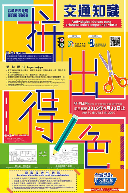 【特訊】為讓兒童認識正確的交通安全理念,從小培養良好的出行習慣,交通事務局主辦、教育暨青年局協辦「交通知識 拼得出色」活動,並由即日起接受報名,4月30日截止交件,歡迎本澳小學生踴躍參加。詳情可瀏覽交通事務局網頁www.dsat.gov.mo,或致電交通事務專線8866 6363查詢。