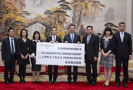 在早前的支票頒贈儀式上,新濠主席兼行政總裁何猷龍將善款交予澳門中聯辦副主任姚堅、澳門中聯辦副秘書長兼社工部部長黃華蓋、澳門中聯辦經濟部副部長朱宏、澳門中聯辦社工部副部長戴儒鳴、澳門中聯辦社工部處長姜正宇及澳門中聯辦經濟部處長左祥華。