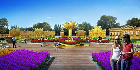展場佈置方面,龍環葡韻展場共分為三個區域,第一區「光影舞動慶回歸」,以金蓮花為中心景觀,延伸出後方具代表性的澳門名勝立體雕塑,通過光影效果渲染出花與名勝之間的微妙關係;第二區「幻彩慶典」,通過鬱金香雕塑、幻彩光廊和特色花卉,將該區打造成互動性強、色彩繽紛的夢幻天地;第三區「百香樂園」,有大片鬱金香花海,使人仿如置身花海的彩色世界,加上具芬芳香氣的花卉,是休憩和玩樂的理想場所。