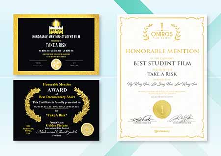 【特訊】作為澳門首個設計學位課程,澳門理工學院設計課程開辦超過廿五載,被譽為澳門藝術文創人才的搖籃。傳承着熱愛藝術、堅持理想的初心,學生努力鍛煉自我,積極參與各項比賽,更屢獲國際獎項。理工學生吳詠恩、李聲浩、黎詠欣的課堂學習成果《TAKE A RISK》,獲得了美國金像國際電影節(American Golden Picture International Film Festival)之最佳紀錄短片榮譽獎、紐約電影獎(New York Movie Awards)每月電影節之學生電影榮譽獎,以及歐尼爾斯電影獎(Oniros Film Awards)之最佳學生電影榮譽獎,備受專業肯定。