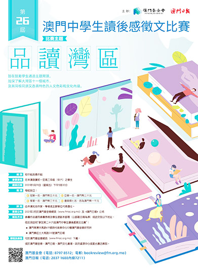 「第二十六屆澳門中學生讀後感徵文比賽」設初中組和高中組兩組別。本屆主題為「品讀灣區」,鼓勵學生通過主題閱讀,加深了解大灣區十一個城市,及其同根同源又各具特色的人文色彩和文化內涵。初中組每篇字數不超過一千五百字,高中組每篇字數不超過二千五百字,每位參賽者限交一篇作品,每所學校每組推薦作品的上限為二十篇,另學生可以個人名義參加。參賽作品連同參賽表格投寄或送交澳門日報,或南灣大馬路619號時代商業中心十三樓澳門基金會研究所,信封須註明「參加第二十六屆澳門中學生讀後感徵文比賽」。