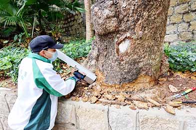 白鴿巢公園的一株假柿木薑子古樹,屬常綠喬木,其生長於小道坡上,環境不理想,過往已修剪枯枝及雜枝以降低風險。市政署樹木管護人員於日前巡查時,發現該樹出現異常情況,隨即使用樹木儀器檢查,結果顯示樹基和樹根多處呈碎木及軟腐狀態,整體生長呈下降趨勢,故此立即施藥及補充營養,希望古樹恢復生機。