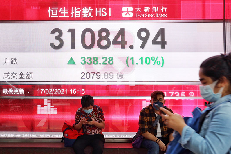 【香港中通社2月17日電】 (記者 劉夢婷)港股17日收報31084點,升338點,升幅1.1%,在7天內累計飆升1971點,再創逾32個月高位。 當日恆生指數低開110點,報30636點;半日升199點,中午報30946點;尾市升勢略收斂,收報31084點,升338點,全日大市成交額2079.88億港元。