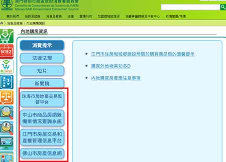 現時消費者可在利用「內地購房資訊」專區直接登入珠海市、江門市、中山市及佛山市四個城市的監管房地產交易資訊平台,核查當地獲批銷售房產的交易資料,包括核查「五證」證號,發展商、房產坐落位置、分層單位的房屋用途、銷售狀態、單位面積等資料,以及相關房產樓款的監管專用帳戶。
