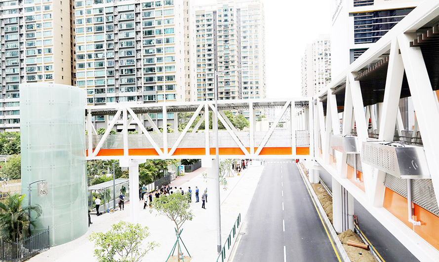 【特訊】為配合特區政府陸路交通運輸政策及離島社區的需要,改善區內行人設施及優化步行環境,特區政府展開了「氹仔基馬拉斯大馬路空中走廊建造工程」,沿基馬拉斯大馬路建造一條行人天橋,為區內居民提供無障礙及安全的人車分隔步行環境,工程已於本月初竣工,並於日前進行臨時驗收。在完成行政手續後,將開放予公眾使用。