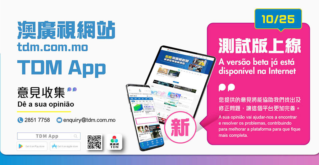 【特訊】為提高接收新聞及節目資訊的便捷性,以及帶來更優質的瀏覽體驗, 澳廣視將於 10 月 25 日推出全新網站及手機應用程式(TDM App)測試版,以全新介面配合新增功能, 繼續為本澳以及世界各地的受眾提供公共廣播服務。