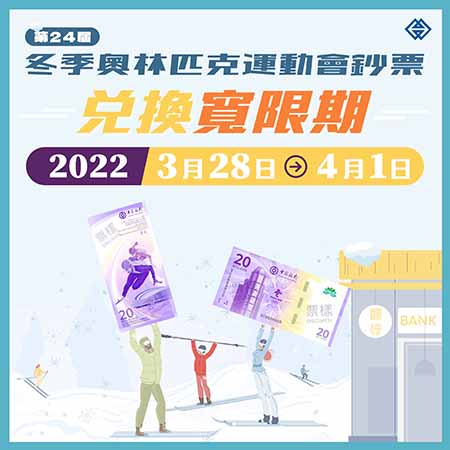 【特訊】金融管理局表示,按照既定安排,第24屆冬季奧林匹克運動會鈔票的兌換期將於2022年3月25日(星期五)結束。為便利已登記但尚未辦理兌換的人士完成兌換,是次兌換增設了寬限期,由2022年3月28日至2022年4月1日止,相關人士請於寬限期內前往所選定的銀行網點辦理兌換。