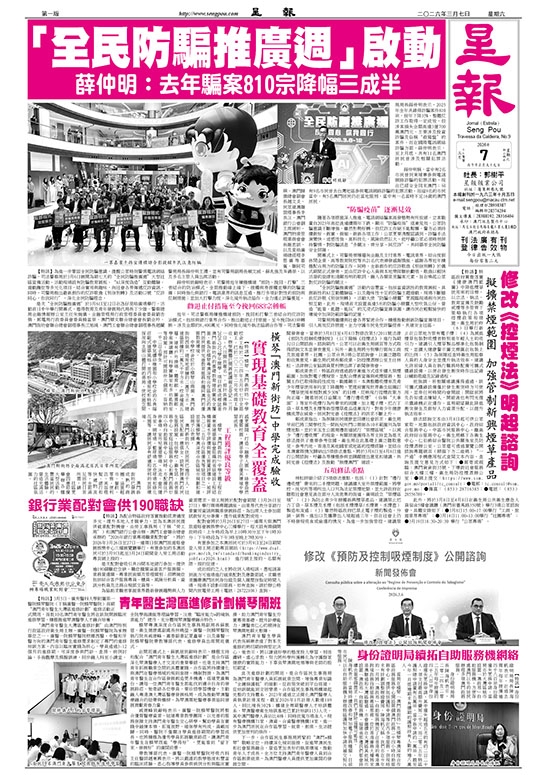 鄭新聰表示,中央港澳工作辦公室主任、國務院港澳事務辦公室主任夏寶龍今天上午在香港特別行政區2026年全民國家安全教育日開幕典禮上發表視頻講話,結合學習貫徹中央政府發布的《“一國兩制”下香港維護國家安全的實踐》白皮書,圍繞“以高水平安全護航香港由治及興 開創‘十五五’時期‘一國兩制’事業新局面”提出“四點要求”,對澳門更好統籌發展和安全也具有重要指導意義。他借此機會提三點建議:
