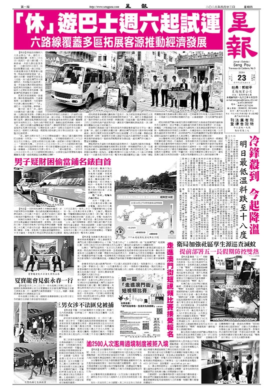 【特訊】特區政府聯同六大休企推出「休」遊巴士.社區探趣計劃,本周六(廿五日)起試行,設三個主題、六條路線,共設九個社區落客點,一日最多約四十班次。社區站點覆蓋北區、新口岸區、中南區關前街及媽閣塘片區等。特區政府期望透過「休」遊巴士計劃,推動更多旅客走入社區,深入感受澳門多元旅遊特色,共同盤活社區經濟,進一步促進本澳休閒旅遊與社區經濟的深度融合,同時為社區中小企開拓客源及商機,推動澳門經濟適度多元發展。