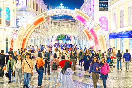 昨晚是平安夜,連同日前回歸紀念日、冬至及聖誕節,不少市民享有六天假期,有市民會選擇外遊,亦有不少市民選擇留澳過節,更有大批內地旅客來澳感受聖誕氣氛,昨日在中區議事亭前地及大三巴一帶,人潮如湧,不少人在聖誕樹等大型裝飾拍照打卡留念,今年市政署以「開心聖誕嘉年華」為主題,在澳門區五十九個、離島區三十一個共九十個地點,當中包括議事亭前地、新馬路、大三巴前地、三盞燈圓形地、高士德大馬路、關閘廣場、媽閣廟前地、觀音像海濱休憩區、港珠澳大橋口岸、中央公園、石排灣郊野公園、橫琴口岸(澳門)等,佈置聖誕燈飾點亮城市,為市民及遊客送上歡樂與祝福。