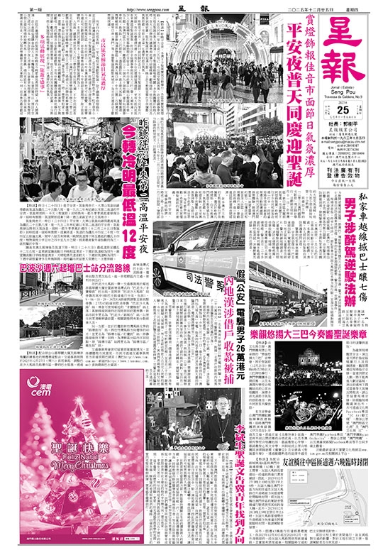 入夜後,議事亭前地及大三巴一帶在平安夜出現人潮,不少市民與旅客在光影節及聖誕燈飾之下拍照留念,由澳門基督徒音樂協會主辦之二零二五歡樂佳音平安夜綜藝晚會,昨晚上八時至十二時假大三巴牌坊耶穌會廣場舉行,主辦單位祈盼藉此活動之主題「當生命遇上愛」時,會帶來盼望、激勵、喜樂、潛能得以發揮。現場有聖詩合唱團獻唱、現場樂隊演奏、兒少舞蹈獻唱、現代劇場及合家歡互動遊戲等。亦有宗教團體在議事亭前地舉行佳音活動,獻唱詩歌,綜藝節目豐富,吸引大批市民及旅客駐足欣賞,十分熱鬧。街上聖誕燈飾璀燦亮麗,市面上洋溢一片濃厚的節日氣氛。