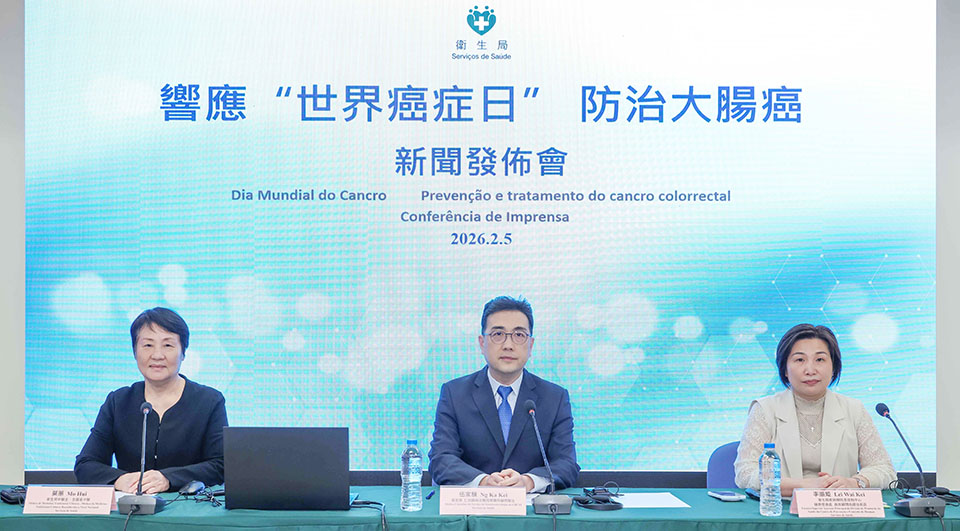 【特訊】為落實《健康澳門藍圖》所訂定的總體目標和指標,特區政府積極推動“健康社區”計劃。昨日(5)日衛生局舉行“響應世界癌症日 防治大腸癌"新聞發佈會,介紹大腸癌預防和治療的方法、“大腸癌篩查計劃”推行成效,以及公佈2月7及8日“大腸癌預防諮詢站"活動安排等。衛生局中醫生、全國名中醫莫蕙、仁伯爵綜合醫院胃腸科顧問醫生伍家驥及疾病預防及控制中心健康促進處首席顧問高級技術員李蕙姬共同出席了新聞發佈會。