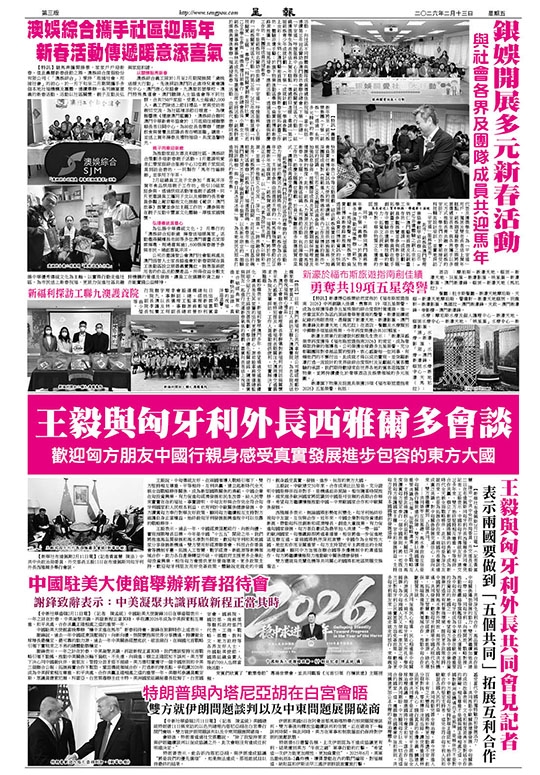 【特訊】農曆新年將至,銀河娛樂集團(下稱「銀娛」)透過一系列多元精彩的新春活動,向社區不同群體與團隊成員傳遞佳節祝福,當中包括:連續第10年冠名贊助由澳門街坊會聯合總會(下稱「街總」)「平安通」呼援服務中心主辦的「銀娛關愛社區大行動」,組織獲獎學生為長者送上賀年糕點,傳遞節日溫暖;邀請「第15屆銀娛青少年成就計劃」(下稱「成就計劃」)學員參觀「銅上金彩——朱炳仁澳門藝術首展」,參與新春主題拓銅畫工作坊,體驗非遺手藝;於旗下物業後勤區舉辦「負責任博彩新春路演推廣」及「福馬迎新春」應節活動,透過互動遊戲與節慶工作坊,與團隊成員共迎新春。
