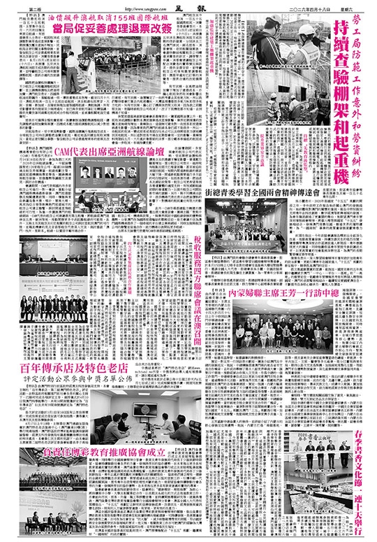 【特訊】為保障建築業從業員的工作安全,提升建築業的職安健水平,勞工事務局(下稱“勞工局")除進行恆常職安健巡查工作外,每年持續對全澳建築工地進行密集式巡查行動。2026年3月17日至30日期間,勞工局派員前往全澳共386個建築工地及工程地點進行職安健巡查,並重點加強對建築工地棚架檢查和起重機檢驗的工作。同時,抽查安全管理人員的日常巡查報告,提醒承造商須按照法例規定,對安全管理人員提出的可行安全建議提供一切必要的支援和協助。