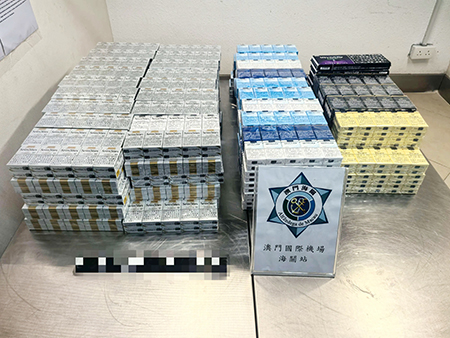 【特訊】澳門海關持續打擊“水客”活動,加強口岸關檢執法工作,並利用科技手段協助,嚴厲打擊偷運物品進出本澳的不法活動。四月十日至十六日,海關在關閘口岸及澳門國際機場截獲二十六宗不法販運個案,合共檢獲約九十三公斤懷疑銀粒、九萬零二百支香煙、二千六百支電子煙、約九百一十五克雪茄、十八支注射藥劑、七十八部舊手提電話及一件電子煙吸食器,貨物市值約一百四十五萬澳門元。