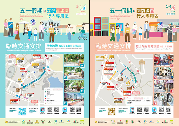 巴士服務方面,5月1日至4日每日早上11時至尾班車,氹仔舊城區四個巴士站將臨時停用,多條巴士路線需改道行駛,乘客可改用臨時站或周邊站點上落;另外,毗鄰關前後街區域的巴士路線則維持正常運作。因應節日期間新馬路的臨時巴士措施,5月1日至5日期間,途經草堆街的巴士路線全日實施臨時靠站安排。交通事務局已指示兩巴於客流高峰站點加強指示及增派人員協助分流乘客,並密切監測各站點候車情況,適時採取調度措施,確保公交交通有序運作。
