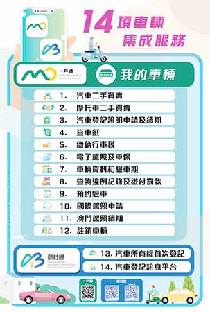 其中,「一戶通」共提供十二項車輛集成服務,具體包括:汽車二手買賣、摩托車二手買賣、汽車登記證明申請及續期、查車紙、繳納行車稅、電子駕照及車保、車輛資料及驗車期、違例紀綠及繳付罰款、預約驗車、國際駕照申請、澳門駕照續期、註銷車輛。此外,「商社通」提供的兩項車輛集成服務,分別為:汽車所有權首次登記、汽車登記訊息平台。