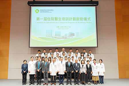 本院首屆住院醫生培訓計劃共招收了28位本澳年青的住院醫生,於今日(7月1日)正式開始為期6年的培訓。儀式開始前學員們首先觀看了北京協和醫院“三位大醫生”記錄短片,感受“大愛成就大醫”的醫學初心。在儀式上,李偉成副院長向在場嘉賓介紹了是次培訓計劃的詳情,同時感謝衛生局的支持,協和澳門醫學中心與衛生局簽訂了《關於委托進行醫學專科培訓的合作協議》,共同攜手提升本地專科醫生專業水平。隨後,由羅奕龍局長、吳文銘院長、李展潤主席、李偉成副院長、戴華浩主任及曾潭飛主任向各位住院醫生頒授工牌,代表著學員們正式開啟他們在協和澳門醫學中心的培訓生涯。