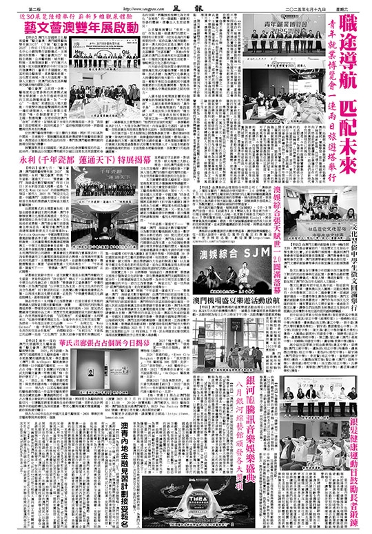 【特訊】澳門大型國際文化藝術盛會“藝文薈澳:澳門國際藝術雙年展2025”(下稱“藝文薈澳2025”)昨日(7月18日)在澳門文化中心小劇院舉行啟動儀式,主場展同步開幕。“藝文薈澳2025”包括主場展、公共藝術展、城市館、特展、本地策展計劃、平行展六大板塊,近30個展覽將於今年7月至10月陸續舉行,薈萃十多個國家/地區的前沿藝術家,革新藝術敘事,活化歷史場域,深入社區肌理,激發人文動力,使澳門成為生活與藝術交織共鳴的繆斯之城。