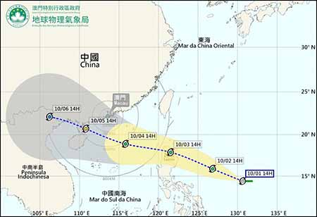 氣象局發出的路徑圖顯示,這個熱帶氣旋有機會在週六至週日(四日至五日)進入本澳四百公里範圍,大致趨向廣東西岸至海南島一帶,週日(五日)日間最接近本澳。氣象局預測,本澳週日有驟雨雷暴,雨勢有時頗大,吹五至六級東至東南風,間中七級及有陣風。由於週日早上正值天文大潮,當局稱,視乎熱帶氣旋路徑及強度變化,不排除部份低窪地區可能受風暴潮影響,呼籲巿民留意最新天氣資訊,適時做好預防措施。