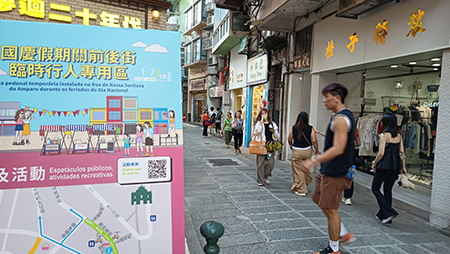 關前後街在國慶黃金周期間首次設置臨時行人專用區,昨日起一連七天每日中午十二時至晚上七時實施。旅遊吉祥物「麥麥」換上運動服裝與市民及旅客互動,現場亦有指示牌提醒居民及旅客相關的臨時交通安排措施,以及宣傳行人專用區內的表演及活動資訊等。經濟及科技發展局局長邱潤華表示,會在活動結束後綜合檢討及評估活動效益、對居民的影響及商戶的得益,再決定是否繼續設置或調整方案。邱潤華稱,設置前提是評估長假期間區內人流會否特別多,人流動線,以及對區內的影響;當局亦會與地區商會合作,在活動期間策劃攤檔、快閃等活動,延長留在區內時間。