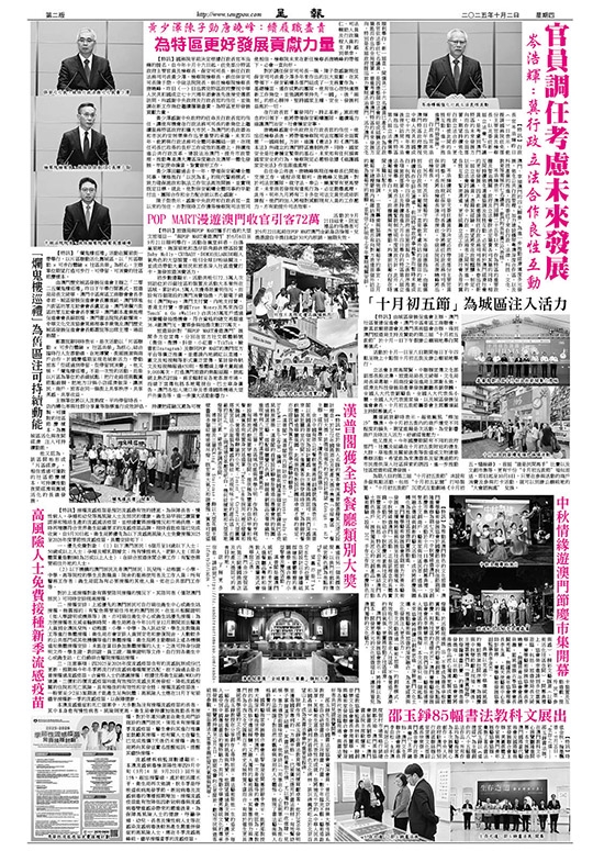 【特訊】國務院早前決定根據行政長官岑浩輝的提名,自今年十月十六日起,任免部分特區政府主要官員及檢察長。保安司司長、候任行政法務司司長黃少澤,檢察院檢察長、候任保安司司長陳子勁,中級法院院長、候任檢察院檢察長唐曉峰,昨日(一)日出席完特區政府慶祝中華人民共和國成立七十六周年酒會後先後接受傳媒訪問,均感謝中央政府及行政長官的信任,並強調在新工作崗位繼續履職盡責,為特區更好發展貢獻力量。