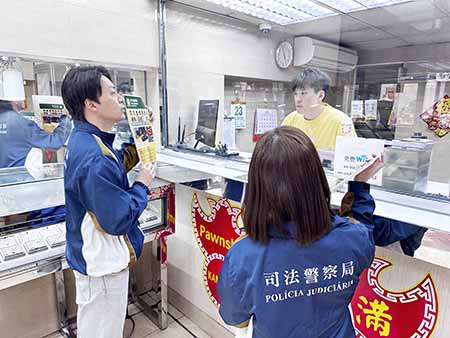 【特訊】因應鄰近地區近日接連發生以“金包銀”假冒足金飾品進行詐騙的案件,為防範相關犯罪手法蔓延至本澳,保障從事黃金回收及當押業務商戶免受損失,司法警察局社區警務及公共關係處於2026年2月23日至25日期間,派員走訪本澳各區相關商戶展開專項防罪宣傳行動,加強業界對新型詐騙手法的認知與警覺性。是次宣傳共走訪約300間珠寶行及押店。